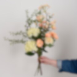 Bukett Emma är ett elegant och välbalanserat arrangemang där hortensia, zinnia, rosenskära och lönnblomma möts i mjuka, naturliga toner. Eucalyptus och muehlenbeckia ger en lätt, luftig känsla som skapar både djup och rörelse. En fyllig och stilren bukett som passar lika bra i moderna som klassiska miljöer – helt skötselfri och enkel att placera.