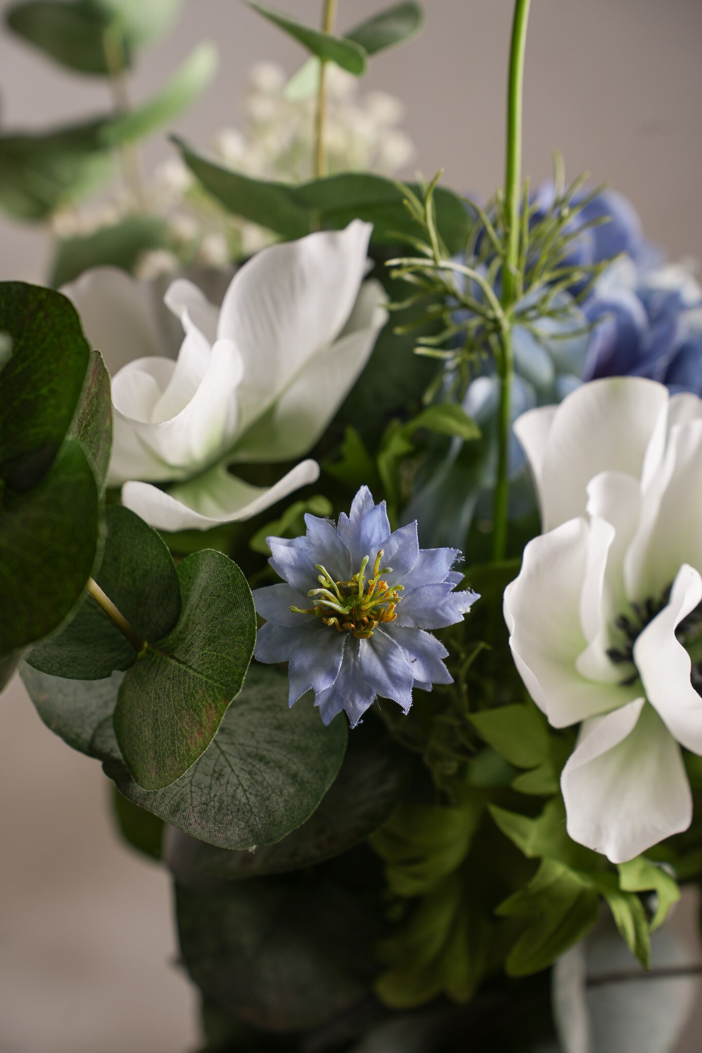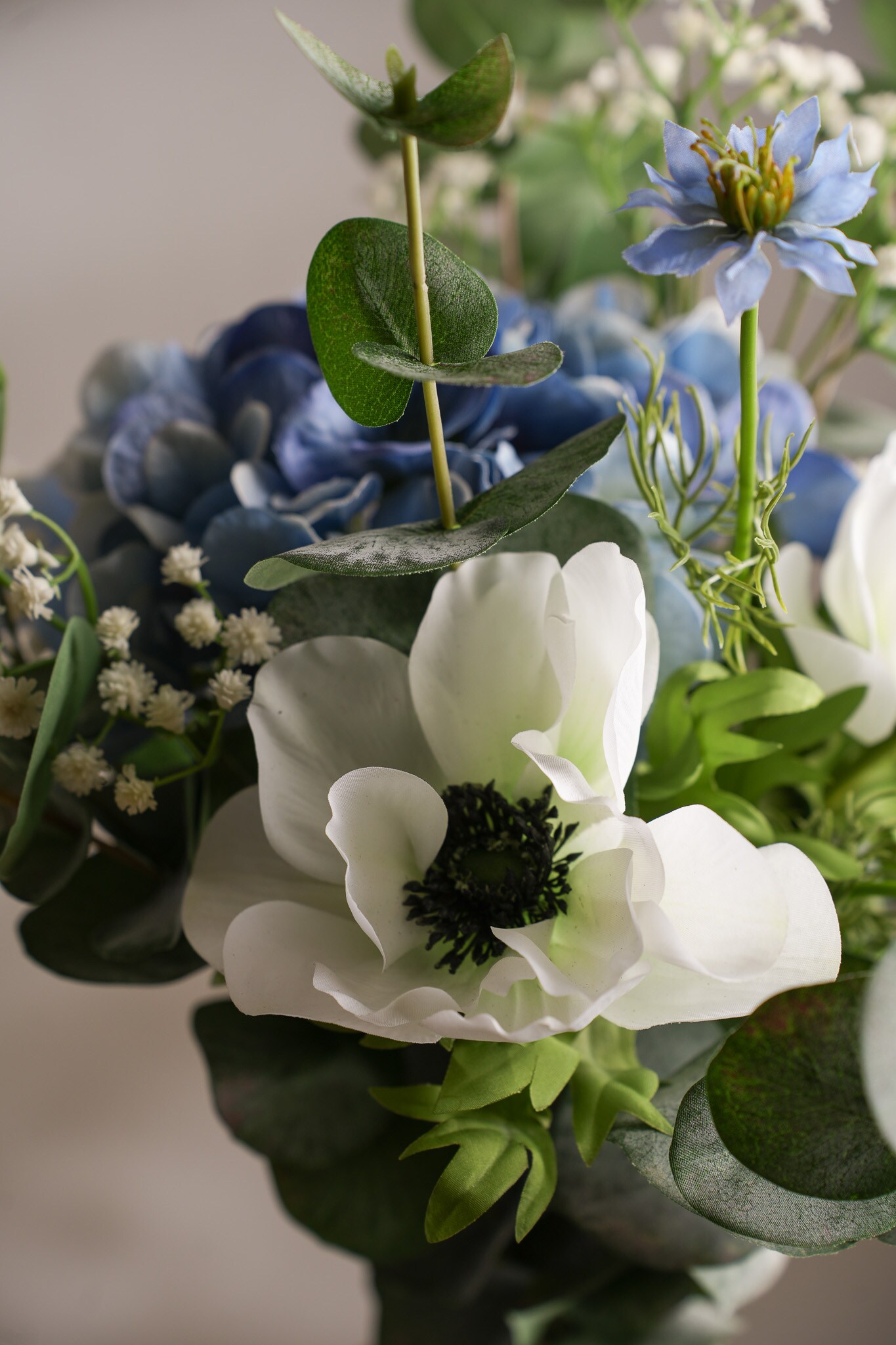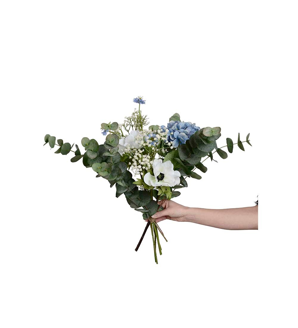 Nova kombinerar hortensia, anemon, eucalyptus, nigella och brudslöja i en sofistikerad komposition. Fylliga blommor blandas med lätta, luftiga inslag som ger en ren och harmonisk känsla. En modern bukett som skapar lugn i alla miljöer och aldrig kräver helt underhållsfri.